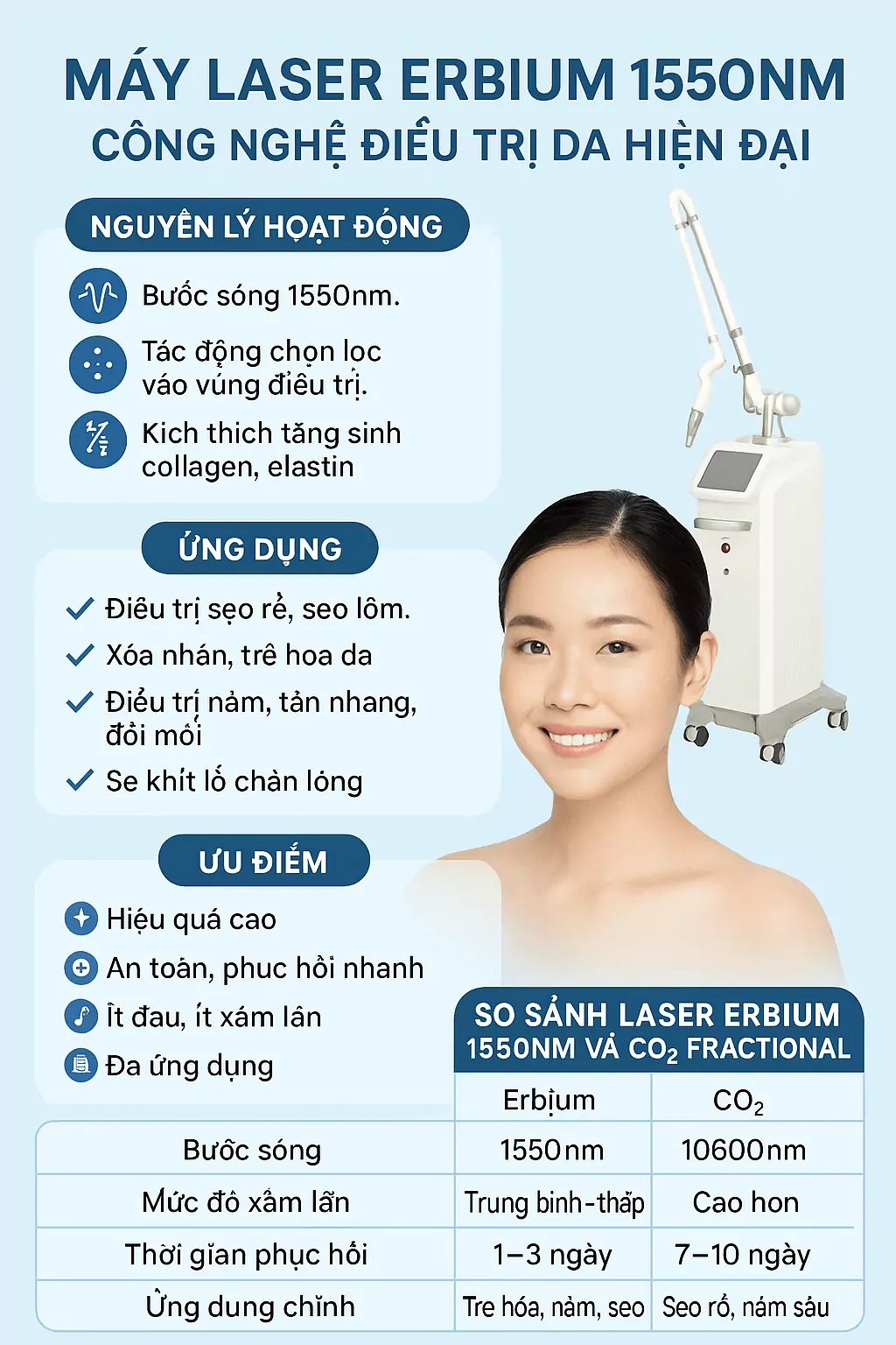 Máy Laser Erbium 1550nm là lựa chọn rất đáng giá cho spa/clinic muốn xây dịch vụ tái tạo da theo hướng hiệu quả – an toàn – downtime ngắn, đặc biệt với các mục tiêu như sẹo rỗ nhẹ–trung bình, lỗ chân lông, texture và trẻ hóa chất lượng da. Để triển khai bền vững, hãy nhớ 3 nguyên tắc: